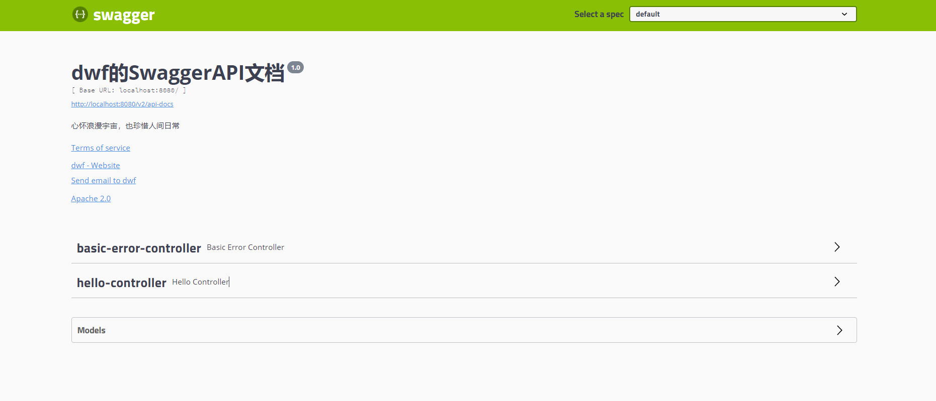 private ApiInfo apiInfo(){ Contact contact = new Contact("dwf","https://dwf0920.github.io/","dwf@0920@163.com"); return new ApiInfo( "dwf的SwaggerAPI文档", "心怀浪漫宇宙,也珍惜人间日常", "1.0", "urn:tos", contact, "Apache 2.0", "http://www.apache.org/licenses/LICENSE-2.0", new ArrayList());