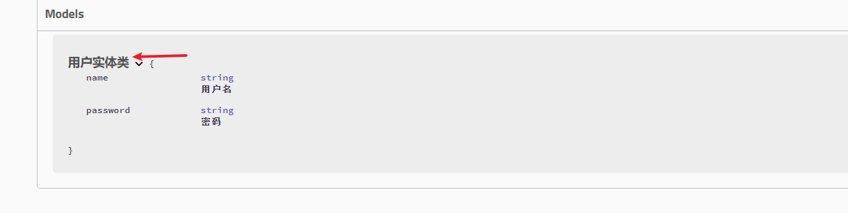 | @ApiModel("用户实体类") public class User { @ApiModelProperty("用户名") public String name; @ApiModelProperty("密码") public String password; }