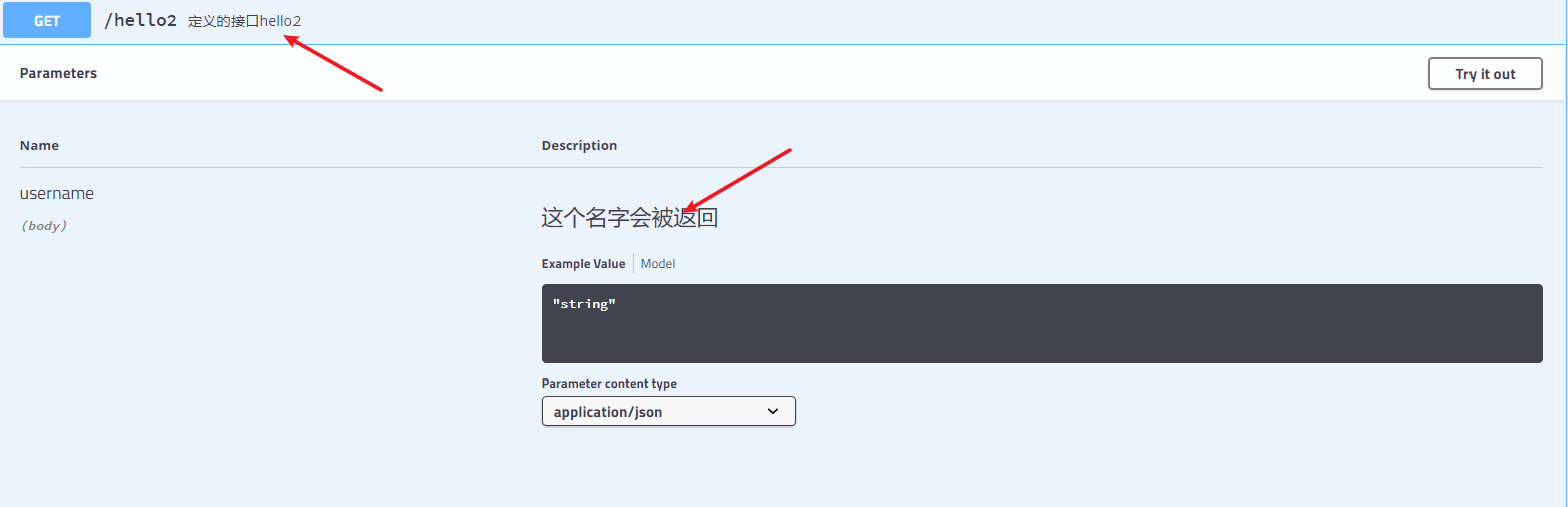 | @ApiOperation("定义的接口hello2") @GetMapping("/hello2") public String hello2(@ApiParam("这个名字会被返回")String username){ return "hello"+username; }